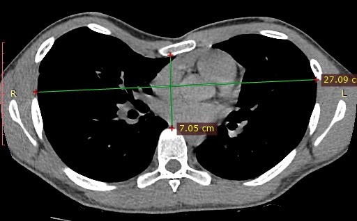 Ten sam pacjent jak wyżej. Linie pokazują odległość od mostka do kręgosłupa i szerokość klatki w miejscu największego zagłębienia. Stosunek obu wymiarów (wskaźnik Hallera) u zdrowego wynosi około 2.5. Tutaj wynosi 3.86, wskazuje na znaczny stopień wady.